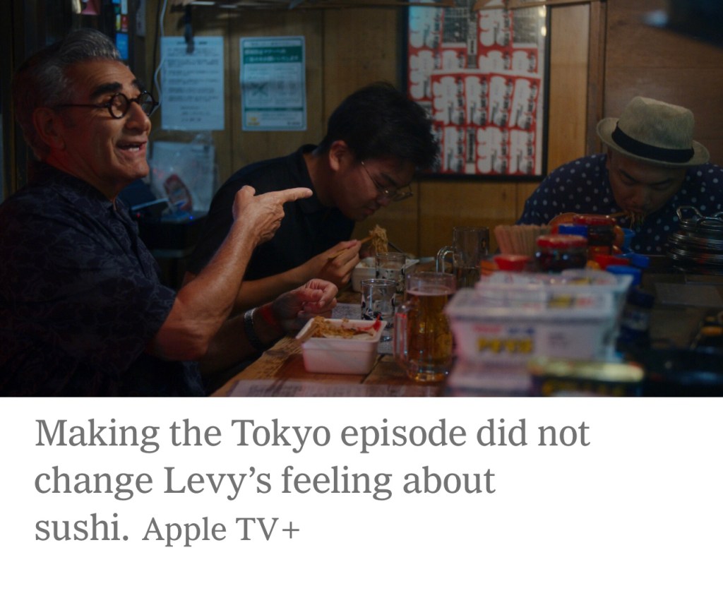 When Levy is offered reindeer fillet, he says, “I don’t want to eat reindeer, to be honest.” In a segment about food in Japan, Levy swallows a tiny morsel of raw fish with the enthusiasm of a toddler “trying” a broccoli floret in order to unlock access to dessert. “It’s me,” Levy says to the camera during the same episode, identifying who the problem is.