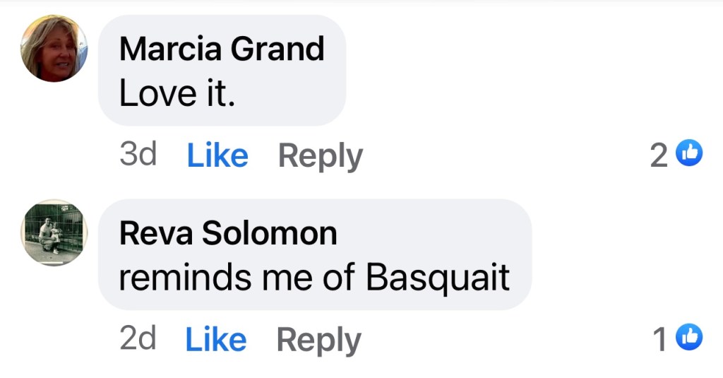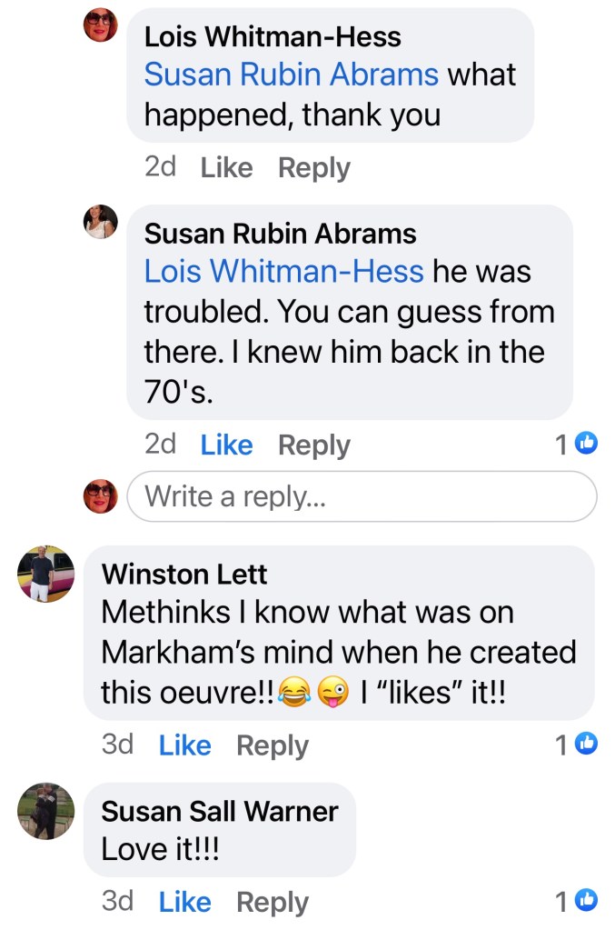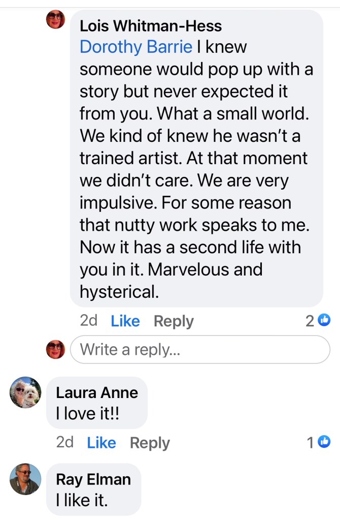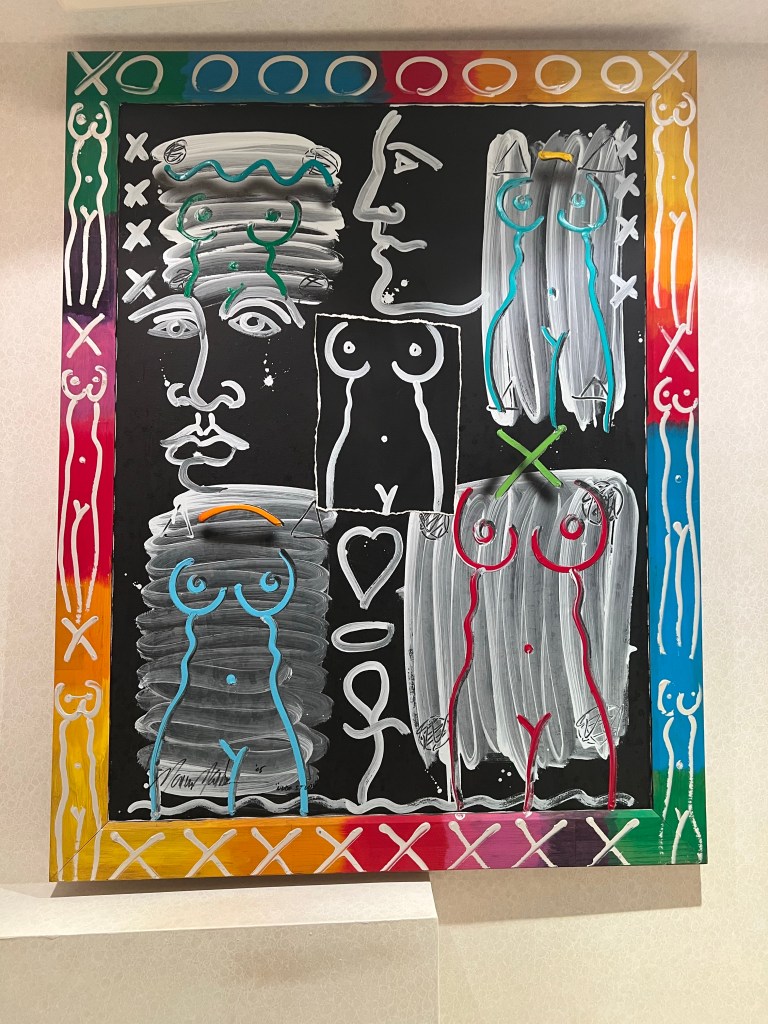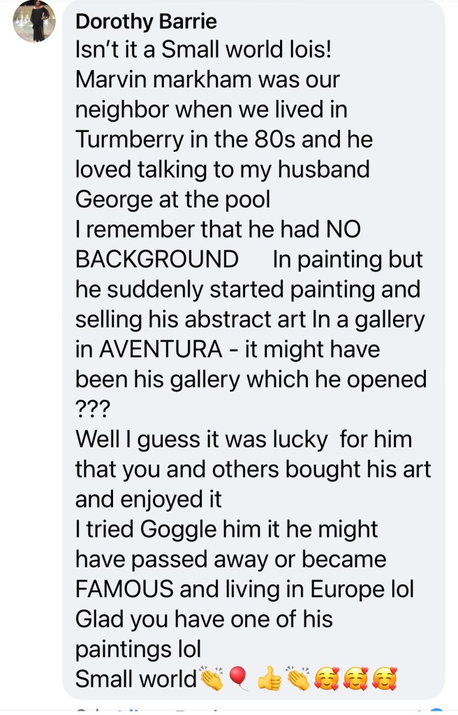 We bought this painting over 20 years ago from an artist in Aventura, Marvin Marham. We found out he recently died. He advertised it in Ocean Drive magazine. It’s insane looking, half amateurish, half daring. That’s why we wanted it.