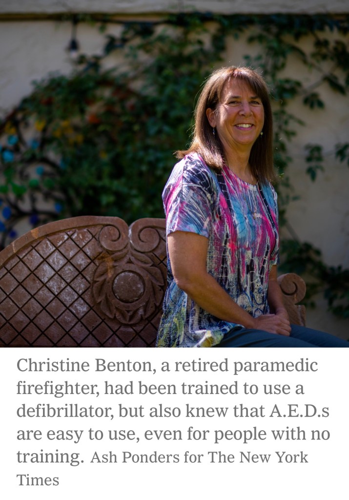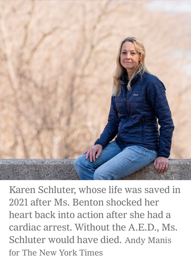 But Ms. Benton had made a consequential decision before she and her husband started out: She had bought a personal automated external defibrillator, or A.E.D., which can shock a person’s heart back to life if it suddenly stops beating. Her plan was to to keep it with her, just in case. It was expensive, it was highly unlikely she would ever use it and her husband was hesitant. But she was adamant.