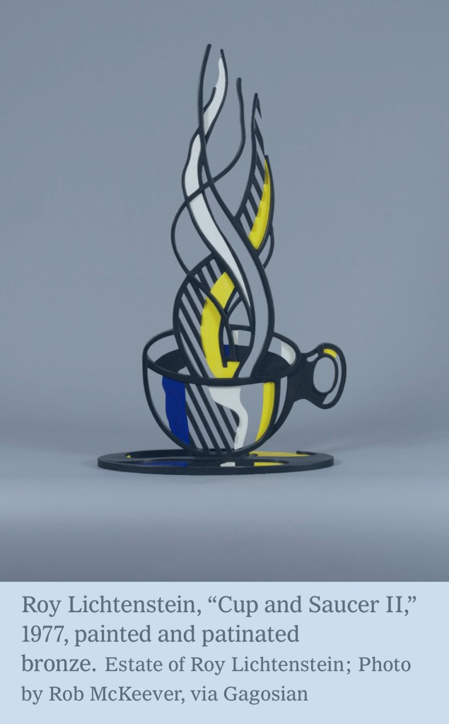 Lichtenstein liked to explore the idea of solidity, Dorothy said, which is why he was drawn to making images of water. “Freezing a brush stroke — which is such a free thing — and conceptualizing it, I think intrigued him,” she said. “Water represented something flowing, but also solid in bronze. Or the smoke from a cup of coffee rising. He was always playing back and forth with those images.”