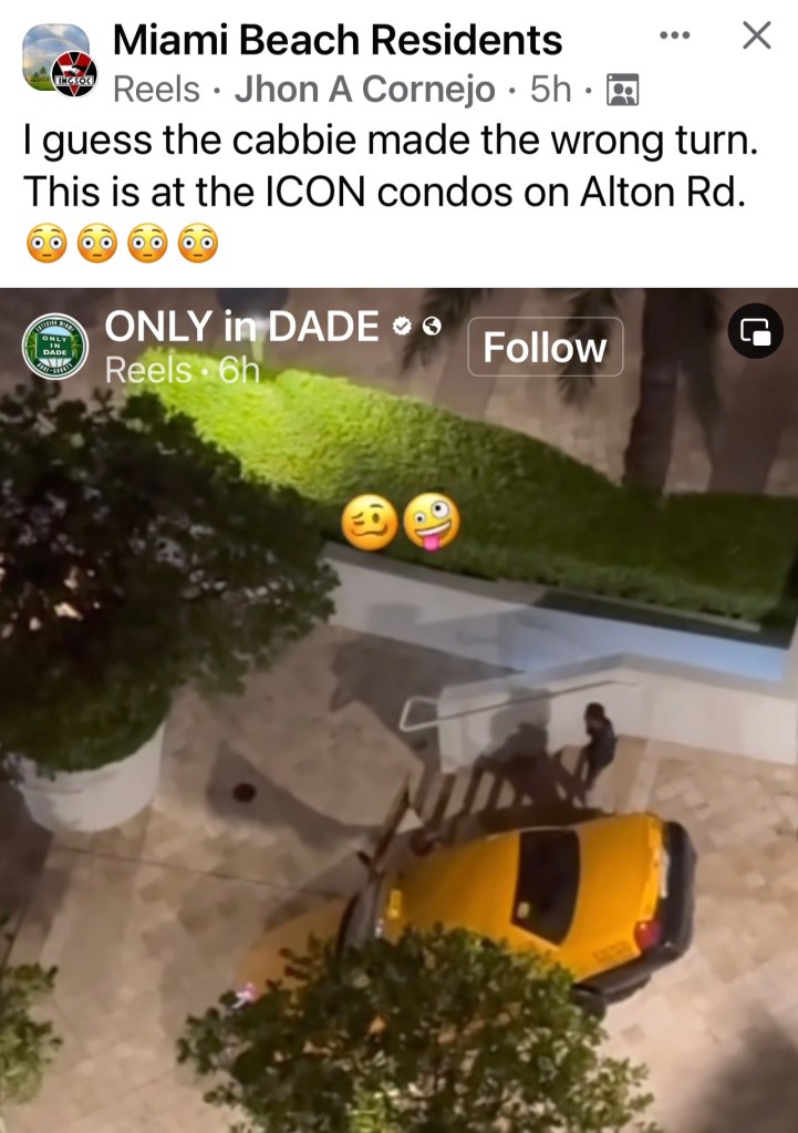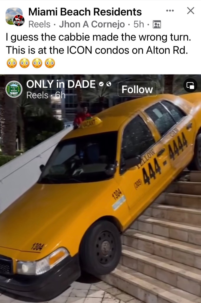 This photo was not doctored. This actually happened a few buildings down the street from us yesterday. Instead of taking the driveway, the cab driver decided to take the steps. Everyone is okay. The driver is still scratching his head. He said he has been to the building many times, He doesnโt know why he made the wrong turn.