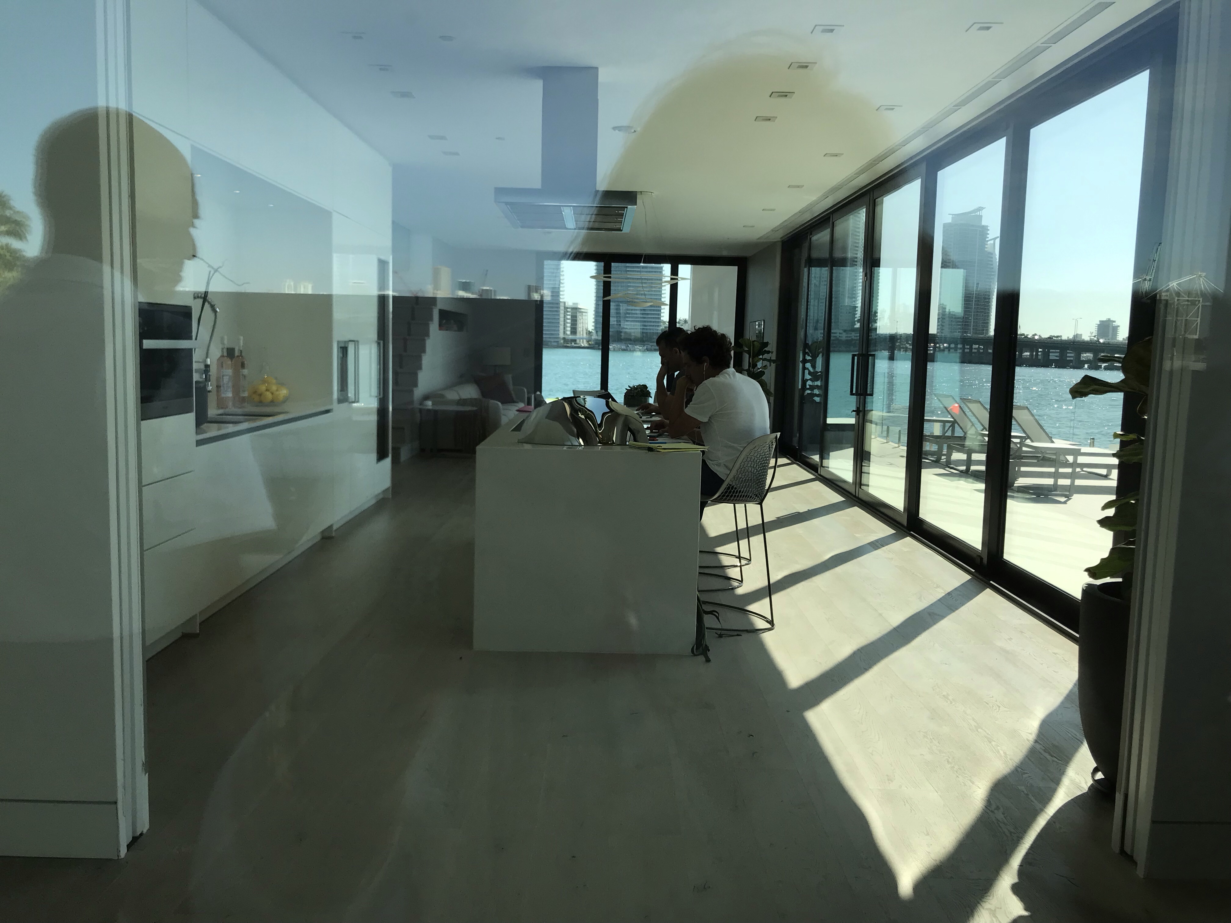 ‘We have art that we’ve recently collected throughout our homes in Miami and New York, but this is just a sample. We have several facilities where we store it too. It really is everywhere. Our hallway is so long, and Serge came up with a fantastic idea for it: We created an art shelf that runs its length to show our smaller works on paper and photography, with larger works on the wall opposite. This space includes works by Holly Coulis, Emma Coleman, and Van Hanos; a painting by Nicole Eisenman of her brother; a painting by Hilary Pecis of the Hollywood Hills; a small work by Eddie Martinez that he gave us as a gift; an early portrait by Henry Taylor; and photography by Zanele Muholi and Wolfgang Tillmans. We fell in love with a painting by Sophie Larrimore which features a poodle (we have one so we’re partial to them).